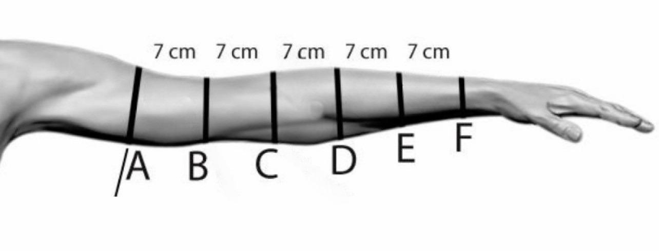 - Marchează punctul A la încheietură (nivelul oaselor stiloide). Din 7 cm în 7 cm proximal: B, C, D, E, F.